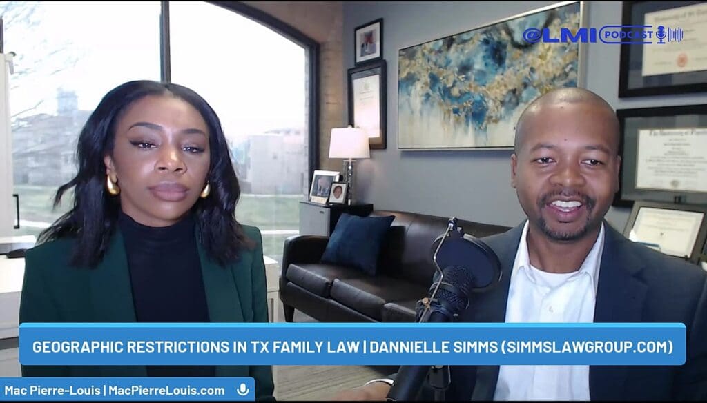 Geographic Restrictions in Texas Family Law – A conversation with Dannielle Simms of Simmslawgroup.com. That is our topic for today. Welcome to the Lawyers and Mediators International Show and Podcast where we discuss law and conflict resolution topics to educate both professionals and everyday people. Catch regular episodes on YouTube and anywhere you get your podcast. Just remember, nothing in these episodes constitutes legal advice, so be sure to talk to a lawyer as cases are fact dependent. Hey everyone, this is Mac Pierre-Louis, attorney, mediator, arbitrator, working throughout Florida and Texas. And today I’m in the office at the podcast studio with a colleague of mine, attorney Dannielle Simms. Dannielle, how are you doing today? I’m doing.