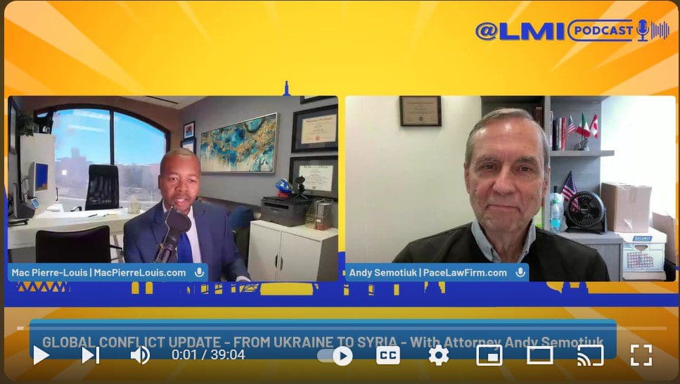 Global conflict update from Ukraine to Syria with attorney Andy Semotiuk. That is our topic for today. Welcome to the Lawyers and Mediators International show and podcast where we discuss law and conflict resolution topics to educate both professionals and everyday people. Catch regular episodes on YouTube and anywhere you get your podcast. Just remember, nothing in these episodes constitutes legal advice, so be sure to talk to a lawyer as cases are fact dependent. Hi everyone, this is attorney Mac Pierre-Louis, lawyer, mediator, arbitrator and I work throughout Florida and Texas and with me today have a guest who’s back to talk more about global affairs and that is attorney Andy Semotiuk. Andy, how are you doing?
