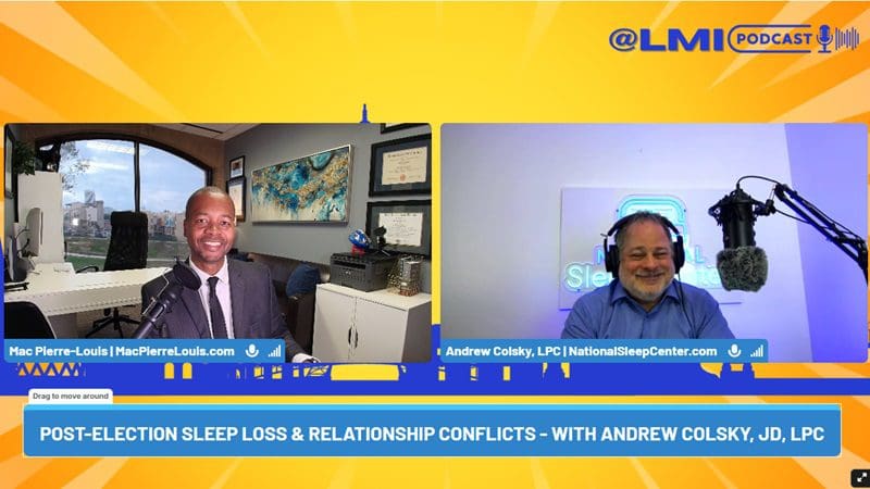 ANDREW COLSKY, JD, LPC, an attorney, mediator, and author, who is also a licensed therapist and sleep expert, returned to the podcast to discuss sleeplessness among Americans due to the 2024 presidential election. The questions posed to him stem from a recent Time Magazine article that referenced “25% of adults have already lost sleep over the U.S. presidential election.”