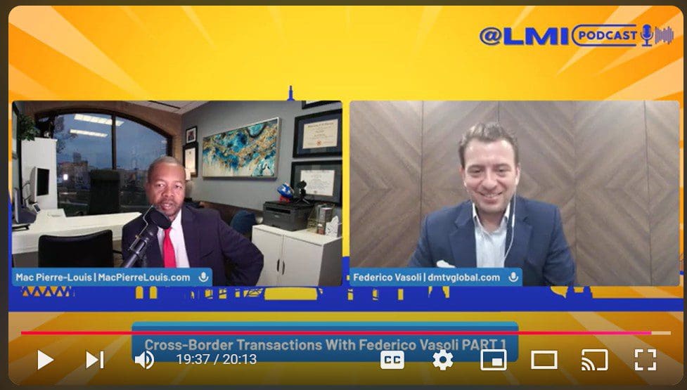 Cross-border Transactions with Federico Vasoli, Part 1. That is our topic for today. Welcome to the Lawyers and Mediators International show and podcast where we discuss law and conflict resolution topics to educate both professionals and everyday people. Catch regular episodes on YouTube and anywhere you get your podcast. Just remember nothing in these episodes constitutes legal advice, so be sure to talk to a lawyer as cases are fact dependent. Hey everyone, this is attorney Mac Pierre-Louis, lawyer, mediator, arbitrator working throughout Florida and Texas. And here we had we are back on the LMI podcast talking to Federico Vasoli on cross-border transactions Federico, how are you today?