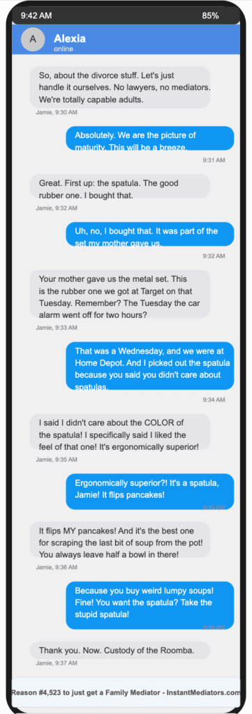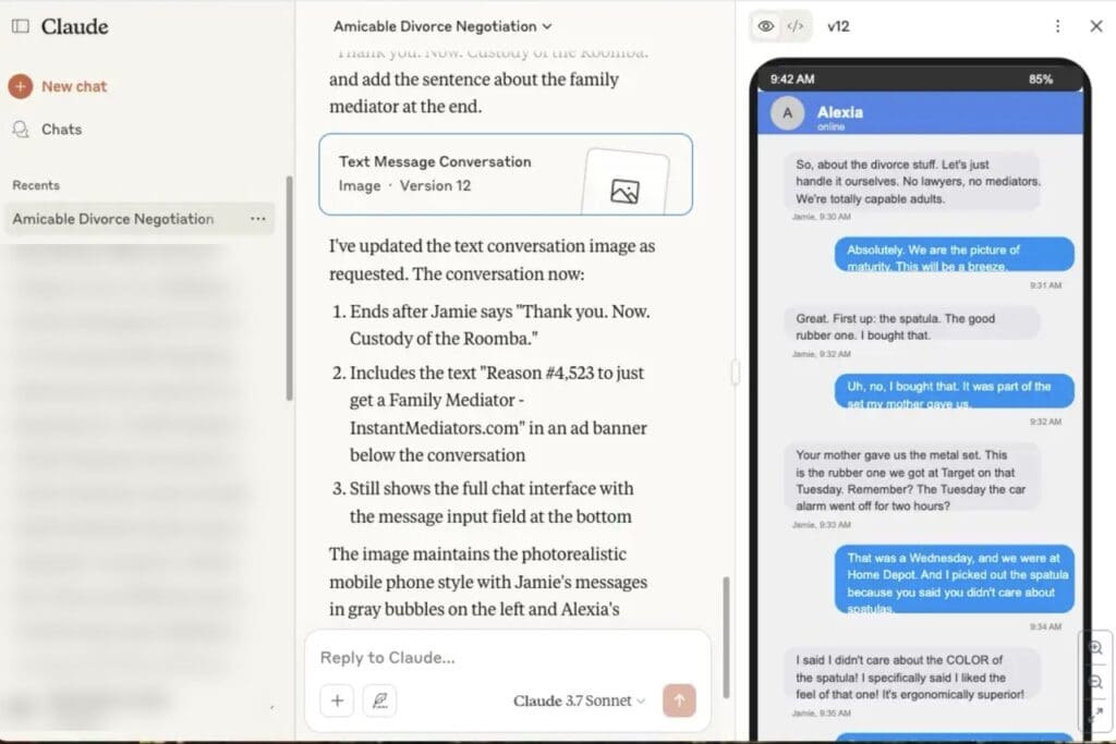 The sky is now the limit – There are no limits to what one could create for their law or mediation practice using AI-generated video. For instance, generating a short, abstract video about navigating complex legal waters or a training video demonstrating a mediation scenario, is now possible. The above video was imagined as the final part of a longer clip or series of clips that brings to life a complex interpersonal scenario between 2 fictitious mediation parties named “Jaime & Alexia”. I had brainstormed this Jaime & Alexia idea and posted it to LinkedIn several weeks back to show an example text of how mediators could engage the public using AI-generated text messaging. While that message was text (generated using Anthropic’s Claude – see images below), Google’s Veo 3 can extend its reach by making the fictitious interaction much more engaging.